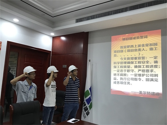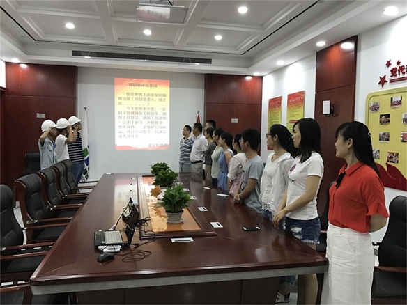 2017年7月15日上午11点,公司肥西上派金星和园项目部全体成员在会议室举行了项目开工前的宣誓活动。由工程部部长领誓,由各部门员工代表、主管及以上人员共同见证。
