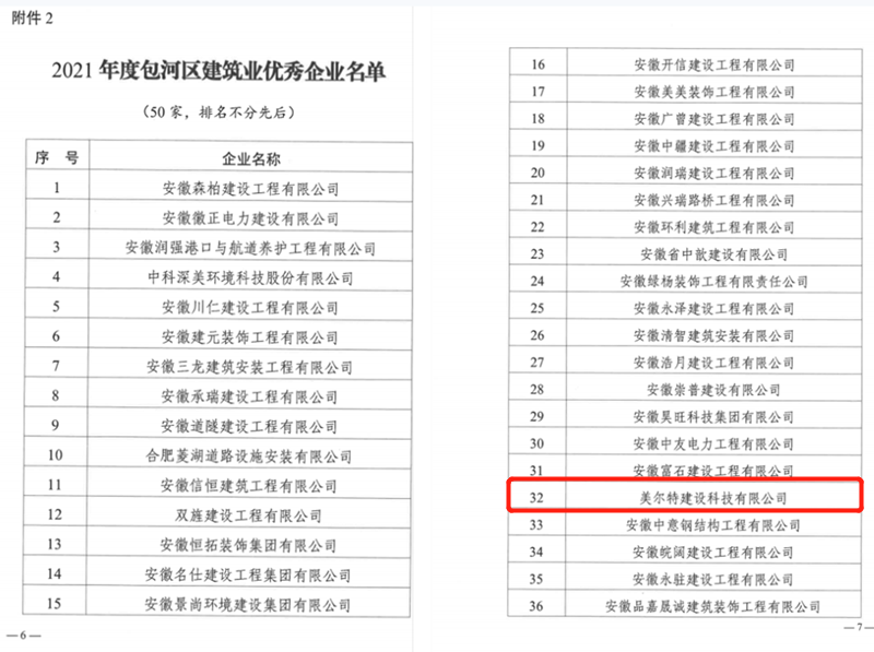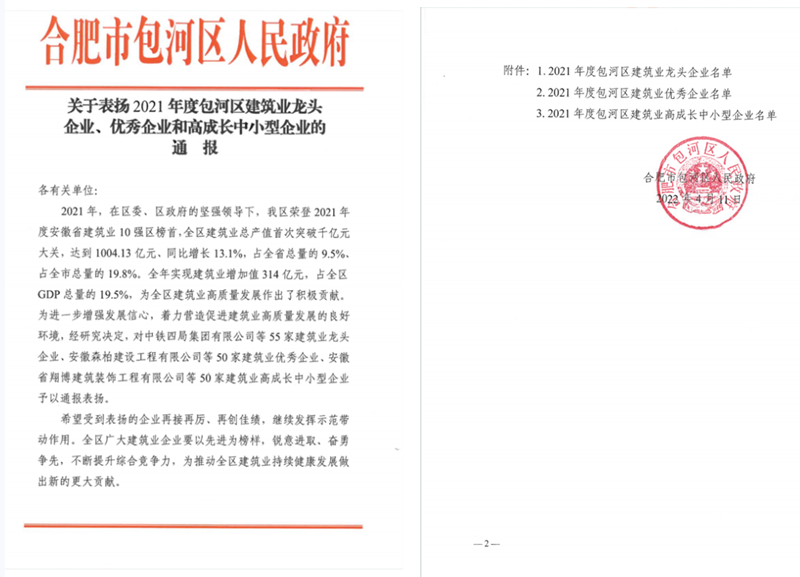 近日,合肥市包河区人民政府发布了《关于表扬2021年度包河区建筑业“双招双引”优秀企业的通报》和《关于表扬2021年度包河区建筑业龙头企业、优秀企业和高成长中小型企业的通报》。通报中BB贝博艾弗森官方网站建设科技有限公司被评为2021年度包河区“双招双引”优秀企业和建筑业优秀企业的荣誉称号。