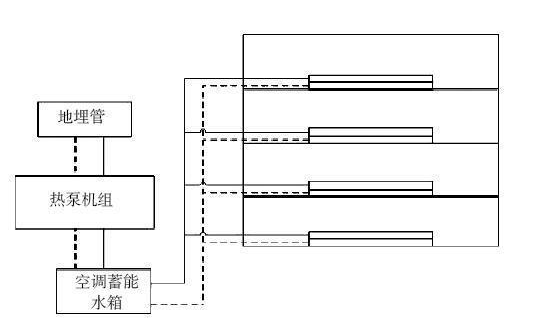 (2)冬季由地源热泵向辐射地板供应热水,冬季时整个循环釆用地源热泵制热,地源热泵制热经过蓄热水箱蓄热,再供给辐射地板进行采暖,冬季新风机組将不运行。