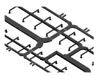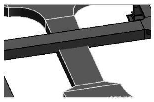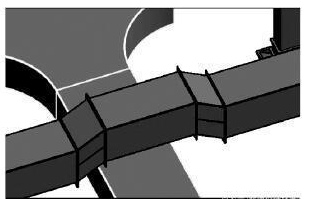 我们设置的送风管偏移量为3200mm,回风管的偏移量为3400mm,虽然偏移量有差距但可以发现管道之间有碰撞现象的岀现如图7所示,这时我们就要进行碰撞调节以检查该碰撞点对Revit模型进行碰撞调节,为防止整个回风管的偏移量提高,可以进行风管桥的搭建,达到调节后的效果即可如图8所示。