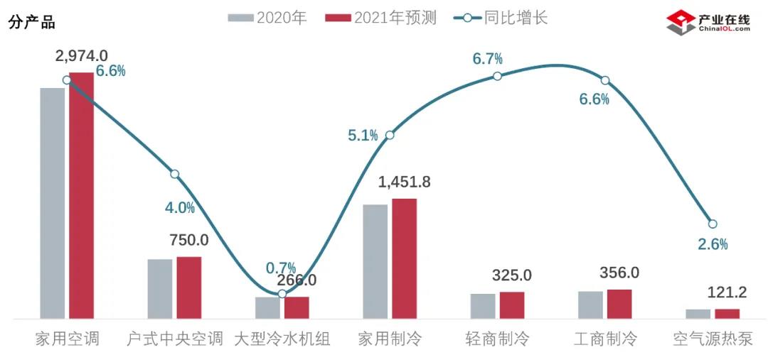 据产业在线最新发布的《2021年中国制冷空调产业运行趋势调研报告》显示,2021年中国制冷空调产业预计同比增长5.6%。细分产品来看,所有品类的销售额都将实现不同程度上涨。