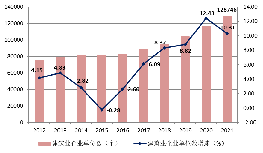 图5 2012–2021年建筑业企业数量及增速