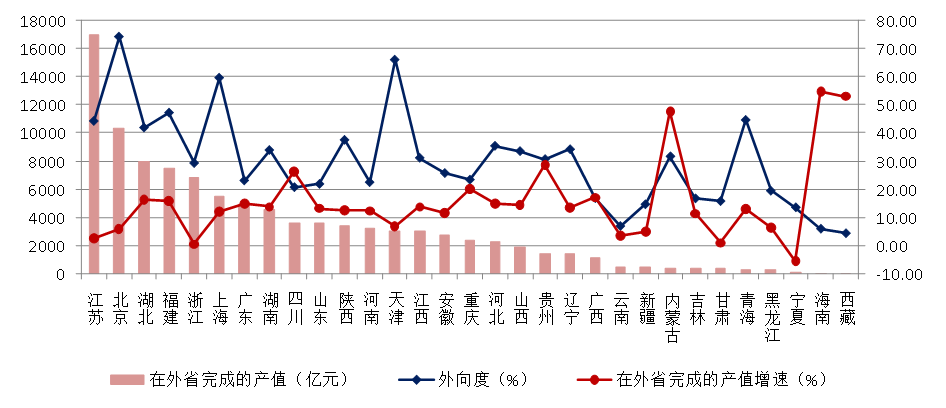 图17 2021年各地区跨省完成的建筑业总产值及外向度