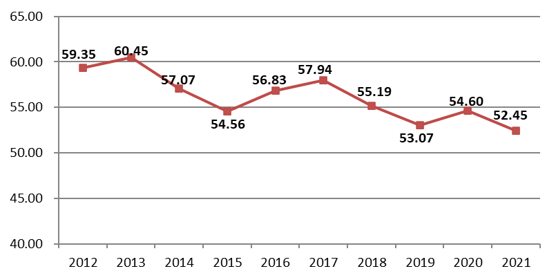 图10 2012–2021年全国建筑业企业新签合同额占合同总额比例