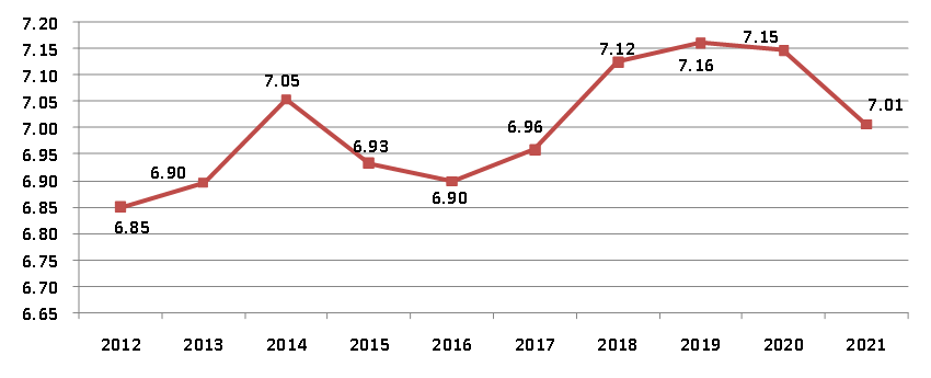 自2012年以来,建筑业增加值占国内生产总值的比例始终保持在6.85%以上。2021年虽有所下降,仍然达到了7.01%(图2),建筑业国民经济支柱产业的地位稳固。