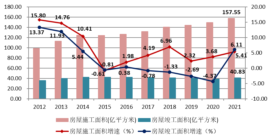 图11 2012–2021年建筑业企业房屋施工面积、竣工面积及增速