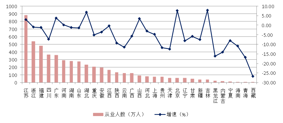 与上年相比,7个地区的从业人数增加,其中,江苏增加人数超过25万人,湖北、广东增加人数超过10万人;24个地区的从业人数减少,其中,四川减少28.76万人、云南减少15.54万人、陕西减少13.32万人、重庆减少11.08万人。吉林、北京、湖北从业人数增速排在前三位,分别为7.83%、7.65%和6.82%;西藏从业人数降幅超过25%,青海、黑龙江、内蒙古、天津、贵州、云南、海南等7个地区的从业人数降幅均超过10%(图18)。