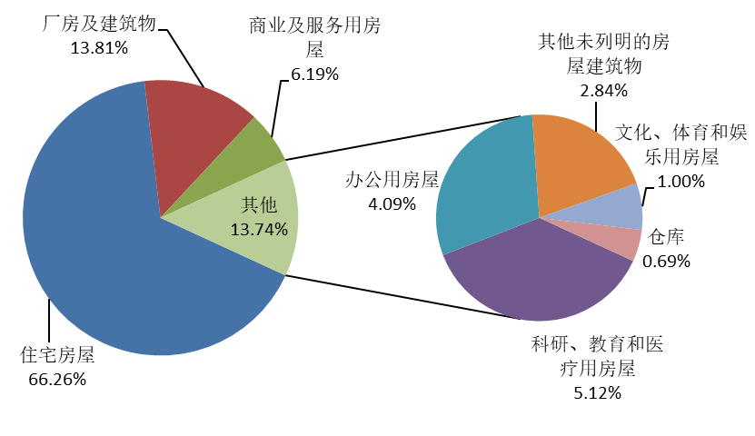 从全国建筑业企业房屋竣工面积构成情况看,住宅竣工面积占最大比重,为66.26%;厂房及建筑物竣工面积占13.81%;商业及服务用房竣工面积占6.19%;其他各类房屋竣工面积占比均在6%以下(图12)。