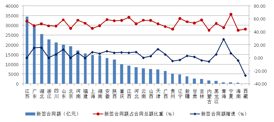 (二)江苏新签合同额以较大优势占据首位,8个地区出现负增长