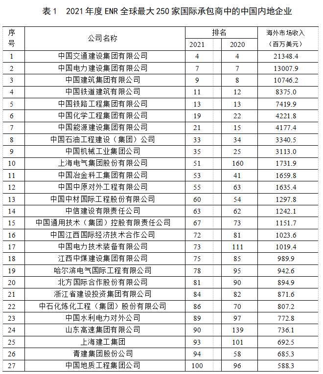 美国《工程新闻记录》(简称“ENR”)杂志公布的2021年度全球最大250家国际承包商共实现海外市场营业收入4203.2亿美元,比上一年度减少了11.1%。我国内地共有78家企业入选2021年度全球最大250家国际承包商榜单,比上一年度增加了4家。入选企业共实现海外市场营业收入1074.6亿美元,比上年度收入合计额减少10.5%,降幅略低于250强企业总体海外收入的缩减幅度,收入合计占250家国际承包商海外市场营业收入总额的25.6%,比上年微增0.2个百分点。