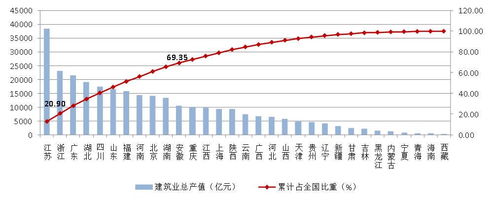 除苏、浙两省外,总产值超过1万亿元的还有广东、湖北、四川、山东、福建、河南、北京、湖南、安徽9个省市,上述11个地区完成的建筑业总产值占全国建筑业总产值的69.35%(图14)。