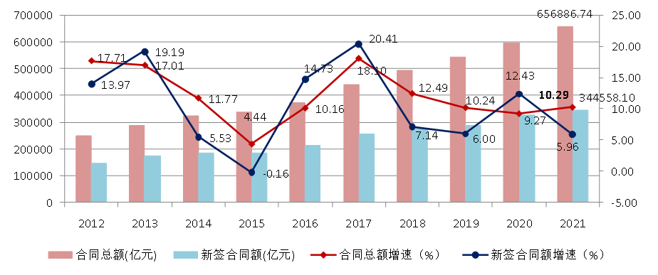 图9 2012–2021年全国建筑业企业签订合同总额、新签合同额及增速