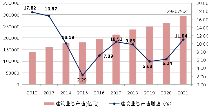 图3 2012–2021年全国建筑业总产值及增速