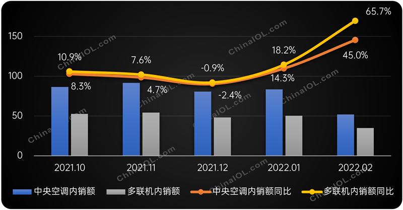 产业在线监测数据显示,2022年2月中央空调市场销售规模达57.7亿元,其中内销额51.9亿元,同比增长45.0%。细分产品中,多联机销售额38.0亿元,同比增长61.0%,其中多联机内销额为34.9亿元,同比增长65.7%,显著高于中央空调同比增速,对比1月份18.2%的增长更是大幅提高。