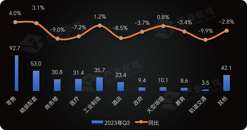 据产业在线数据显示,2023年三季度,零售端在渠道库存高企的压力下仅实现4.0%的同比增长;工业制造虽保持增长态势,但增长幅度明显收窄;大型场馆因杭州亚运会场馆的更新改造项目,获得了增长契机。