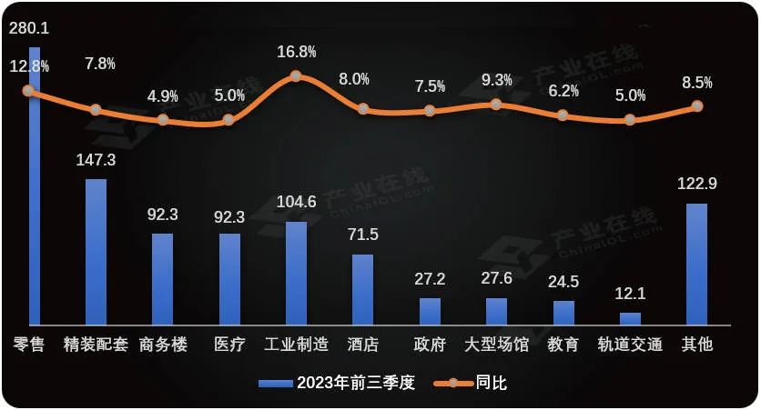 应用矩阵增加,渠道结构多元化发展。据产业在线数据显示,2023年前三季度,零售端市场在上半年加速出货的基础上,实现了12.8%的同比增长,但进入下半年,库存高压的现状也为零售端全年发展走势埋下隐患;工业制造虽保持增长态势,但增长幅度有所收窄;大型场馆因杭州亚运会场馆的更新改造项目,获得了一定的增长契机。