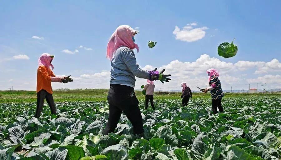 ▲ 宁夏固原市原州区彭堡镇姚磨村村民在蔬菜基地收获圆白菜。