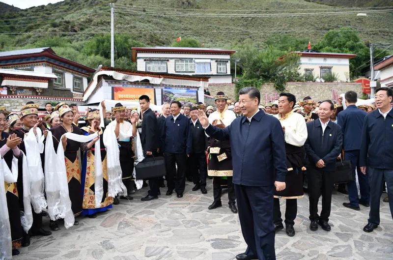 7月21日至23日,中共中央总书记、国家主席、中央军委主席习近平来到西藏,祝贺西藏和平解放70周年,看望慰问西藏各族干部群众。这是21日下午,习近平在林芝市巴宜区林芝镇嘎拉村考察时,向村民们挥手致意。